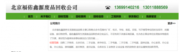 北京福佑鑫源再生資源廢品回收選用我司企業(yè)的網(wǎng)站設(shè)計產(chǎn)品,其seo關(guān)鍵詞為資源回收,鎖定海外排名,覆蓋谷歌,雅虎,必應(yīng)等海外主流搜索引擎,搶占海外市場, 網(wǎng)站打開速度快,用戶體驗(yàn)好,風(fēng)格多樣化,用戶互動性高,增強(qiáng)用戶黏著度 北京福佑鑫源再生資源廢品回收成立于2011年,是經(jīng)北京市市場監(jiān)督管理局審核的有資質(zhì)的公司,其統(tǒng)一社會信用代碼:911101147609196425。公司地址:北京市昌平區(qū)北七家鎮(zhèn)南七家莊村南北京廣利福源再生資源回收市場內(nèi)2號