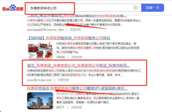 東莞柏*家政服務(wù)有限公司整站優(yōu)化最快上詞效果展示