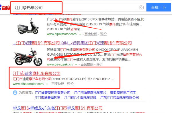 江門市迪豪摩托車有限公司選用我司企業(yè)摩托車的網(wǎng)站優(yōu)化產(chǎn)品,其SEO關(guān)鍵詞有摩托車。從站內(nèi)到站外,人工智能全新搜索優(yōu)化技術(shù),最快7天關(guān)鍵詞排名上首頁,利用互聯(lián)網(wǎng)營銷手法,多平臺,多樣化進行品牌內(nèi)容鋪設(shè),營造企業(yè)正面形象。江門市迪豪摩托車有限公司成立于1998年,是經(jīng)江門市市場監(jiān)督管理局審核的有資質(zhì)的公司,其統(tǒng)一社會信用代碼:91440703712223018G。公司地址: 廣東省江門市蓬江區(qū)宏達工業(yè)區(qū)建達北路7號。