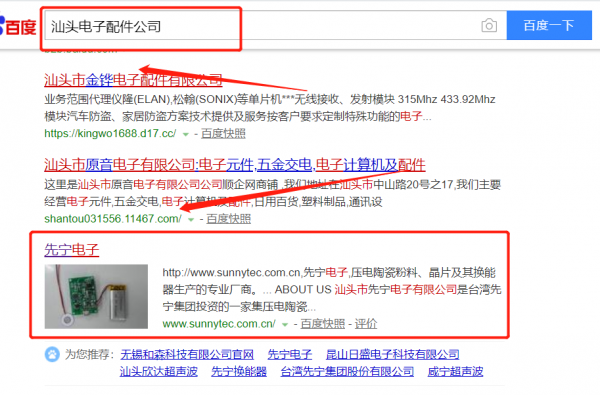 我們公司與汕頭市先寧電子有限公司合作中,對這個公司所經(jīng)營的電子配件這個行業(yè)提供了百度快照排名,與該公司的合作,更多的客戶讓我們公司為其提供搜索引擎優(yōu)化推廣,通過每一次合作,我們公司不斷完善自己,同時希望合作伙伴在經(jīng)營的路上越來越好。
