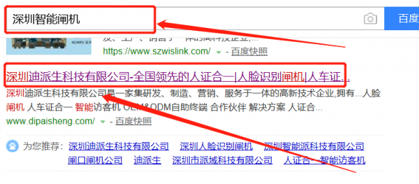 我們公司與深圳迪派生科技有限公司合作中,對這個(gè)公司所經(jīng)營的智能閘機(jī)這個(gè)行業(yè)提供了關(guān)鍵詞搜索排名,與該公司的合作,更多的客戶讓我們公司為其提供關(guān)鍵詞搜索排名,通過每一次合作,我們公司不斷完善自己,同時(shí)希望合作伙伴在經(jīng)營的路上越來越好。