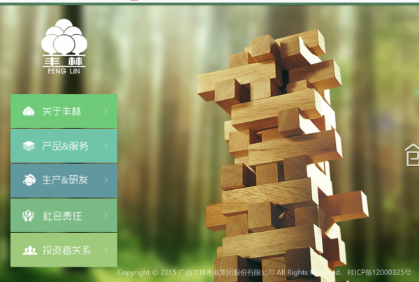 豐林木業(yè)集團股份有限公司(以下簡稱“公司”或“本公司”)是香港豐林國際有限公司董事長劉一川先生創(chuàng)始的一家中外合資股份有限公司,是廣西的一家國內(nèi)A股上市企業(yè),公司股票簡稱“豐林集團”,股票代碼601996。公司是“國家高新技術(shù)企業(yè)、國家林業(yè)重點龍頭企業(yè)和農(nóng)業(yè)產(chǎn)業(yè)化國家重點龍頭企業(yè)”,獲得35項國家專利,是國內(nèi)智能精造技術(shù)綠色環(huán)保企業(yè)。公司于2010年被中國經(jīng)濟觀察報評為“2010年度中國最佳低碳企業(yè)評選”20強,在當時的中國人造板行業(yè)極為少見。近年來,公司屢獲“中國林業(yè)產(chǎn)業(yè)突出貢獻獎”、“中國最佳低碳企業(yè)”、“中國林業(yè)重點龍頭企業(yè)”、“中國板材行業(yè)最具影響力(品牌)制造企業(yè)”、“中國國際林業(yè)產(chǎn)業(yè)博覽會金獎”等多項殊榮,在行業(yè)和市場上樹立了良好的品牌形象。2017年,公司產(chǎn)品獲得中國林產(chǎn)工業(yè)協(xié)會的“精品人造板”與廣西質(zhì)量技術(shù)監(jiān)督局的“廣西名牌”榮譽稱號,集團總經(jīng)理王高峰先生被中國林產(chǎn)工業(yè)協(xié)會授予“中國林產(chǎn)工業(yè)終身成就獎”。