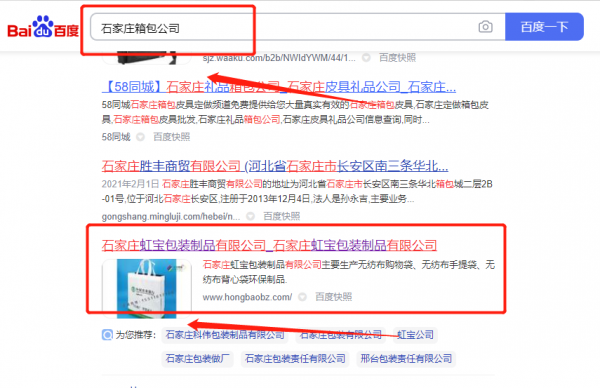 我們公司與石家莊*寶包裝制品有限公司合作中,對(duì)這個(gè)公司所經(jīng)營(yíng)的箱包這個(gè)行業(yè)提供了優(yōu)化排名,與該公司的合作,更多的客戶(hù)讓我們公司為其提供快速排名,通過(guò)每一次合作,我們公司不斷完善自己,同時(shí)希望合作伙伴在經(jīng)營(yíng)的路上越來(lái)越好。