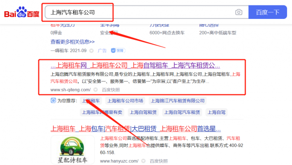 上海啟*汽車(chē)租賃服務(wù)有限公司百度排名快上詞效果展示