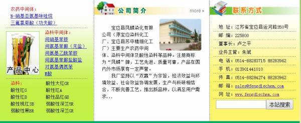 寶應(yīng)縣*蝶染化有限公司(原寶應(yīng)染料化工廠、寶應(yīng)縣蘇中精細(xì)化工廠)主要生產(chǎn)農(nóng)藥中間體、染料中間體及酸性染料等品種。注冊(cè)商標(biāo)為“鳳蝶”牌,工藝先進(jìn)、質(zhì)量可靠,產(chǎn)品在國(guó)內(nèi)外市場(chǎng)享有一定聲譽(yù)。我廠堅(jiān)持以“雙贏”為宗旨,經(jīng)濟(jì)效益與環(huán)境效益、社會(huì)效益協(xié)調(diào)發(fā)展,生產(chǎn)與科研相結(jié)合,不斷完善工藝,推出新品種,以滿足用戶(hù)需求。