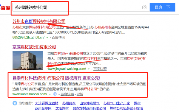 昆泰焊材科技(蘇州)有限公司選用我司企業(yè)焊接材料的網(wǎng)站優(yōu)化產(chǎn)品,其SEO關(guān)鍵詞有焊接材料。采用全球領(lǐng)先的關(guān)鍵詞三維云計算系統(tǒng),智能關(guān)鍵詞報價查詢,徹底杜絕高價、朦朧價。自助提交優(yōu)化任務(wù),自由設(shè)定指定關(guān)鍵詞,指定排名位置,避免傳統(tǒng)銷售誘導(dǎo)。昆泰焊材科技(蘇州)有限公司成立于2016年,是經(jīng)蘇州市市場監(jiān)督管理局審核的有資質(zhì)的公司,其統(tǒng)一社會信用代碼:91320506MA1MULB42A。公司地址:江蘇省蘇州市吳中區(qū)長橋街道財智商務(wù)廣場2幢601-616號A區(qū)003號工位(集群登記)。