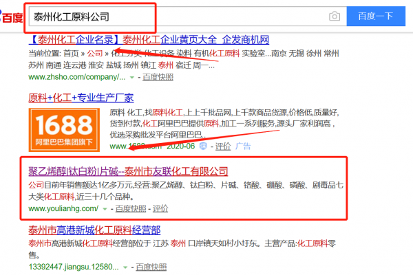 我們公司與泰州市友聯(lián)化工有限公司合作中,對(duì)這個(gè)公司所經(jīng)營(yíng)的化工原料這個(gè)行業(yè)提供了百度快照排名,與該公司的合作,更多的客戶讓我們公司為其提供百度快照排名,通過(guò)每一次合作,我們公司不斷完善自己,同時(shí)希望合作伙伴在經(jīng)營(yíng)的路上越來(lái)越好。
