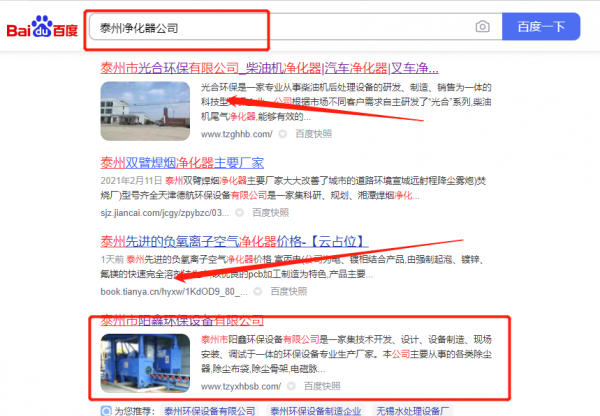 我們公司與泰州市陽*環(huán)保設(shè)備有限公司合作中,對(duì)這個(gè)公司所經(jīng)營(yíng)的凈化器這個(gè)行業(yè)提供了快速排名,與該公司的合作,更多的客戶讓我們公司為其提供SEO推廣,通過每一次合作,我們公司不斷完善自己,同時(shí)希望合作伙伴在經(jīng)營(yíng)的路上越來越好。