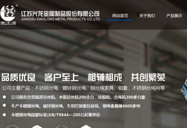 江蘇興龍金屬制品股份有限公司地處于“中國不銹鋼名鎮(zhèn)”——江蘇省興化市戴南鎮(zhèn),創(chuàng)立于1985年,一直從事各類鋼絲繩及鋼絲繩制品的研制、生產(chǎn)與銷售?,F(xiàn)有員工420人.工廠占地面積86500平方米。公司擁有各型高速拉絲機、水箱拉絲機200余臺,捻股機、合繩機300多臺套。年產(chǎn)不銹鋼絲繩、鍍鋅鋼絲繩、車用控制索拉筋線、鋼繩索具等6600多噸。廣泛應用于港口碼頭、建筑裝璜、農(nóng)林石化、漁業(yè)、汽車、醫(yī)療器械等行業(yè)是國內(nèi)規(guī)模較大、品種較全的不銹鋼絲繩及鋼絲繩索具生產(chǎn)基地。002年取得自營出口權資格,產(chǎn)品70%出口海外,遠銷美國、英國、意大利、德國、日本、韓國、西班牙、澳大利亞、南非、印度等國家。