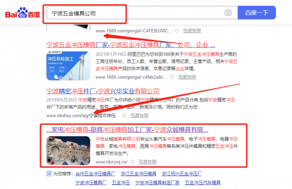 我們公司與寧波眾*模具有限公司合作中,對(duì)這個(gè)公司所經(jīng)營(yíng)的五金模具這個(gè)行業(yè)提供了網(wǎng)站推廣,與該公司的合作,更多的客戶讓我們公司為其提供關(guān)鍵詞搜索排名,通過每一次合作,我們公司不斷完善自己,同時(shí)希望合作伙伴在經(jīng)營(yíng)的路上越來越好。