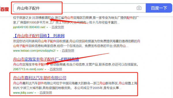 舟山市*利達(dá)汽車部件有限公司選用我司企業(yè)電子配件行業(yè)的網(wǎng)站優(yōu)化產(chǎn)品,其SEO關(guān)鍵詞有電子配件。通過對搜索引擎目標(biāo)關(guān)鍵詞優(yōu)化,使目標(biāo)網(wǎng)站的相關(guān)信息顯示在百度首頁,為企業(yè)挖掘更多的潛在客戶的同時(shí)帶來海量的商機(jī)。舟山市*利達(dá)汽車部件有限公司成立于2005年,是經(jīng)舟山市市場監(jiān)督管理局審核的有資質(zhì)的公司,其統(tǒng)一社會(huì)信用代碼:91330921**31423341。公司地址:浙江省舟山市岱山縣東沙鎮(zhèn)余金工業(yè)區(qū)。