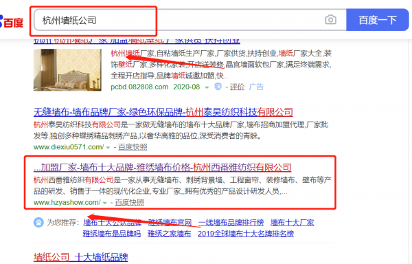我們公司與杭州*番雅紡織有限公司合作中,對(duì)這個(gè)公司所經(jīng)營(yíng)的墻紙這個(gè)行業(yè)提供了關(guān)鍵詞搜索排名,與該公司的合作,更多的客戶讓我們公司為其提供關(guān)鍵詞搜索排名,通過(guò)每一次合作,我們公司不斷完善自己,同時(shí)希望合作伙伴在經(jīng)營(yíng)的路上越來(lái)越好。