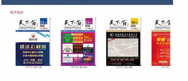 《天下石》雜志為南安*然文化傳播旗下平臺(tái)。創(chuàng)刊于2005年10月,為月刊,閩固印廣登號(hào)(2015)第01號(hào),國際標(biāo)準(zhǔn)刊號(hào):ISSN2224-3984。因?yàn)榱己玫姆?wù)、前瞻的設(shè)計(jì)理念、豐富的文化內(nèi)涵,尤其是良好的廣告效益而獲得社會(huì)各界的廣泛贊譽(yù),多年來《天下石》已在國內(nèi)石材行業(yè)形成自己的影響力,并擁有眾多忠實(shí)讀者和客戶群體。本刊還得到包括中國石材工業(yè)協(xié)會(huì)、上海石材行業(yè)協(xié)會(huì)、山東省石材行業(yè)協(xié)會(huì)、福建省石材行業(yè)協(xié)會(huì)、廣東省石材行業(yè)協(xié)會(huì)等專家學(xué)者、領(lǐng)導(dǎo)們的一致好評(píng)。