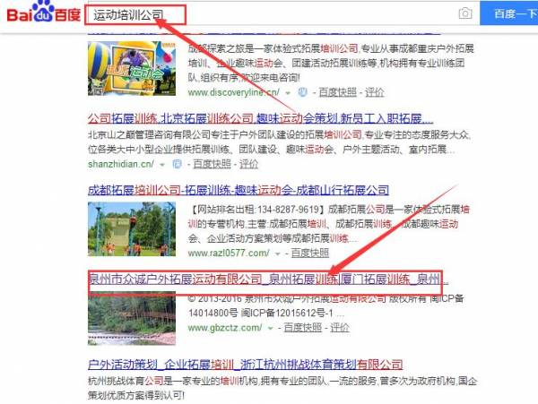 泉州市眾誠(chéng)戶外拓展運(yùn)動(dòng)有限公司選用我司企業(yè)運(yùn)動(dòng)培訓(xùn)行業(yè)的網(wǎng)站優(yōu)化產(chǎn)品,其SEO關(guān)鍵詞有泉州市眾誠(chéng)戶外拓展運(yùn)動(dòng)有限公司,泉州拓展訓(xùn)練,廈門(mén)拓展訓(xùn)練,泉州拓展培訓(xùn)|廈門(mén)拓展培訓(xùn),泉州企業(yè)拓展,廈門(mén)企業(yè)拓展,泉州旅游拓展,廈門(mén)旅游拓展。其特點(diǎn)是通過(guò)百度SEO優(yōu)化排名技術(shù)幫助企業(yè)網(wǎng)站挖掘客戶潛在需求,提升關(guān)鍵詞排名和客戶咨詢量。通過(guò)搜索引擎優(yōu)化為企業(yè)帶來(lái)持續(xù)、低成本的自然流量,提升企業(yè)銷(xiāo)售額,使企業(yè)由被動(dòng)營(yíng)銷(xiāo)網(wǎng)絡(luò)推廣變?yōu)橹鲃?dòng)營(yíng)銷(xiāo)網(wǎng)絡(luò)推廣。泉州市眾誠(chéng)戶外拓展運(yùn)動(dòng)有限公司成立于2012年,是經(jīng)泉州市市場(chǎng)監(jiān)督管理局審核的有資質(zhì)的公司,其統(tǒng)一社會(huì)信用代碼:91350526052329852K 。公司地址:福建省泉州市德化縣國(guó)寶云龍谷。