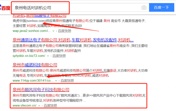 我們公司與泉州市順風(fēng)耳電子科技有限公司合作中,對這個公司所經(jīng)營的電話對講機(jī)這個行業(yè)提供了關(guān)鍵詞搜索排名,與該公司的合作,更多的客戶讓我們公司為其提供關(guān)鍵詞搜索排名,通過每一次合作,我們公司不斷完善自己,同時希望合作伙伴在經(jīng)營的路上越來越好。