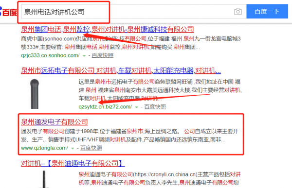 我們公司與泉州市通發(fā)電子有限公司合作中,對這個公司所經(jīng)營的電話對講機這個行業(yè)提供了關鍵詞搜索排名,與該公司的合作,更多的客戶讓我們公司為其提供關鍵詞搜索排名,通過每一次合作,我們公司不斷完善自己,同時希望合作伙伴在經(jīng)營的路上越來越好。