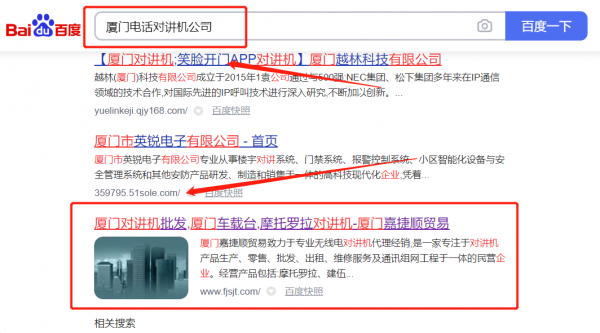 我們公司與廈門嘉*順貿(mào)易有限公司合作中,對(duì)這個(gè)公司所經(jīng)營的電話對(duì)講機(jī)這個(gè)行業(yè)提供了快速排名,與該公司的合作,更多的客戶讓我們公司為其提供SEO優(yōu)化,通過每一次合作,我們公司不斷完善自己,同時(shí)希望合作伙伴在經(jīng)營的路上越來越好。