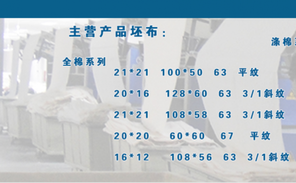 公司主要產(chǎn)品全棉、滌棉、人棉、T/C、CVC坯布織造, 公司技術(shù)力量雄厚,產(chǎn)品質(zhì)量穩(wěn)定。公司擁有噴氣、劍桿等先進(jìn)織造技術(shù),公司在保持原有產(chǎn)品(滌棉紗線、全棉紗線、滌棉坯布、全棉坯布、人棉坯布)更注重于產(chǎn)品的研究與開發(fā),積極致力于產(chǎn)業(yè)升級,開發(fā)新產(chǎn)品:有機(jī)棉坯布。產(chǎn)品方向立足于工裝面料的研發(fā)和生產(chǎn),品種包括:平布、斜紋布、染色布、紗卡、線卡、府綢、及紗線等,主要銷往山東、江蘇、浙江、四川、湖南等地,為國內(nèi)各大知名品牌的工裝企業(yè)和服裝出口企業(yè)長期提供面料。德州六棉紡織有限公司全體員工歡迎各界朋友光臨。注:本廠190噴氣織機(jī)可生產(chǎn)40英寸—71英寸光邊產(chǎn)品。另有340噴氣110臺,可承接各種訂單。
