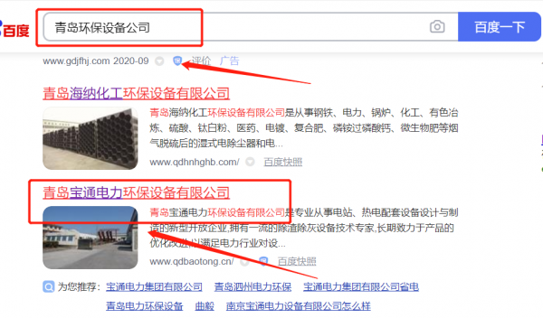 青島*通電力環(huán)保設(shè)備有限公司百度排名最快上詞效果展示