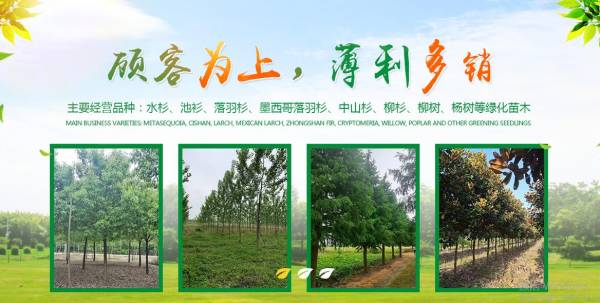 主要經(jīng)營品種:水杉、池衫、落羽杉、墨西哥落羽杉、中山杉、柳杉、柳樹、楊樹等綠化苗木,產(chǎn)業(yè)銷售到了湖北、四川、重慶、廣東、江蘇、上海、浙江、福建、河南、安徽、貴州等地,不同規(guī)格,應(yīng)有盡有。